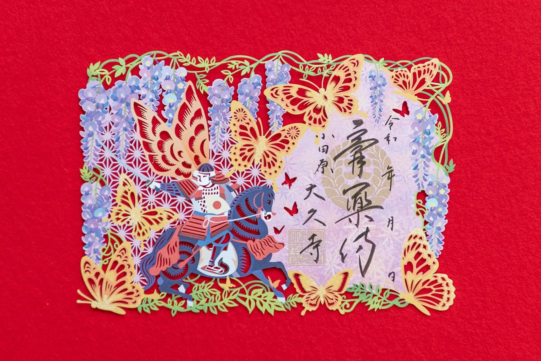 大久寺を建立した小田原藩祖大久保忠世公をモチーフにした御朱印です。忠世公の旗指物「金の揚羽蝶」と、大久保家の家紋に用いられる藤を象ったデザインになります。